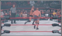 میک ابیس رو به گوشه رینگ می کوبه و به داخل رینگ می فرسته.
