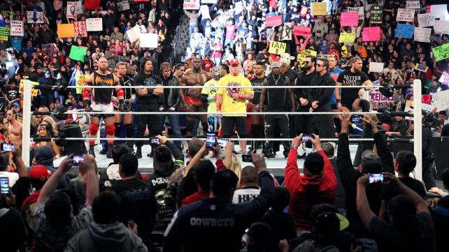 در همون ابتدای کار شاهد هستیم کل راستر دابلیودابلیوایی در رینگ و دور و اطراف اون حضور دارن ، جان سینا میگه که من باید عذرخواهی بکنم بخاطر کاری که هفته گذشته ناچار به انجامش بودم ، ست رالینز تهدید کرده بود که به گردن ادج آسیب جدی میزنه و سلامتی اون خیلی مهم بود ، مردم شعار What سرمیدن...