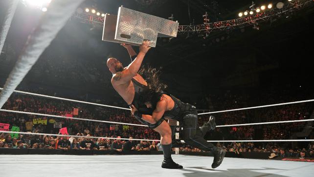 میبرتش داخل رینگ ، و پلکان فلزی رو هم برمیداره و میخواد بازهم بهش ضربه بزنه ولی رینز بهش اسپیرمیزنه.