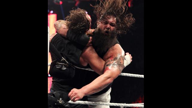 حالا هردو روی رمپ هستن و بری زیر پای حریفش رو خالی میکنه ، بازهم اینبار با برانکارد ضربه ای به پای امبروز میزنه. به طرف رینگ حرکت میکنن جایی که وایت یک بیگ رایت هند میزنه ، پای دین رو به میله کنار رینگ میکوبونه ...
