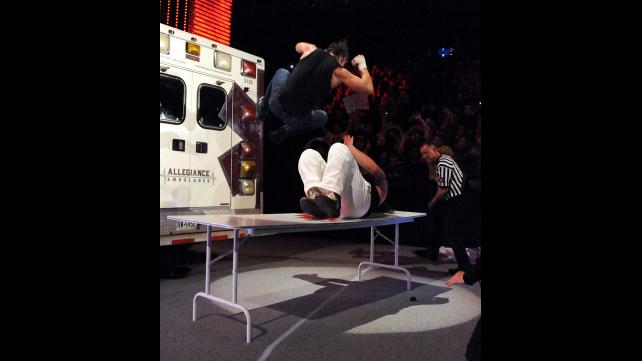 در همون ابتدای کار امبروز تعادل حریفش رو بهم میزنه و وایت از رینگ فرار میکنه ، و در خارج از رینگ حالا امبروز حریفش رو به پشت میز میندازه.